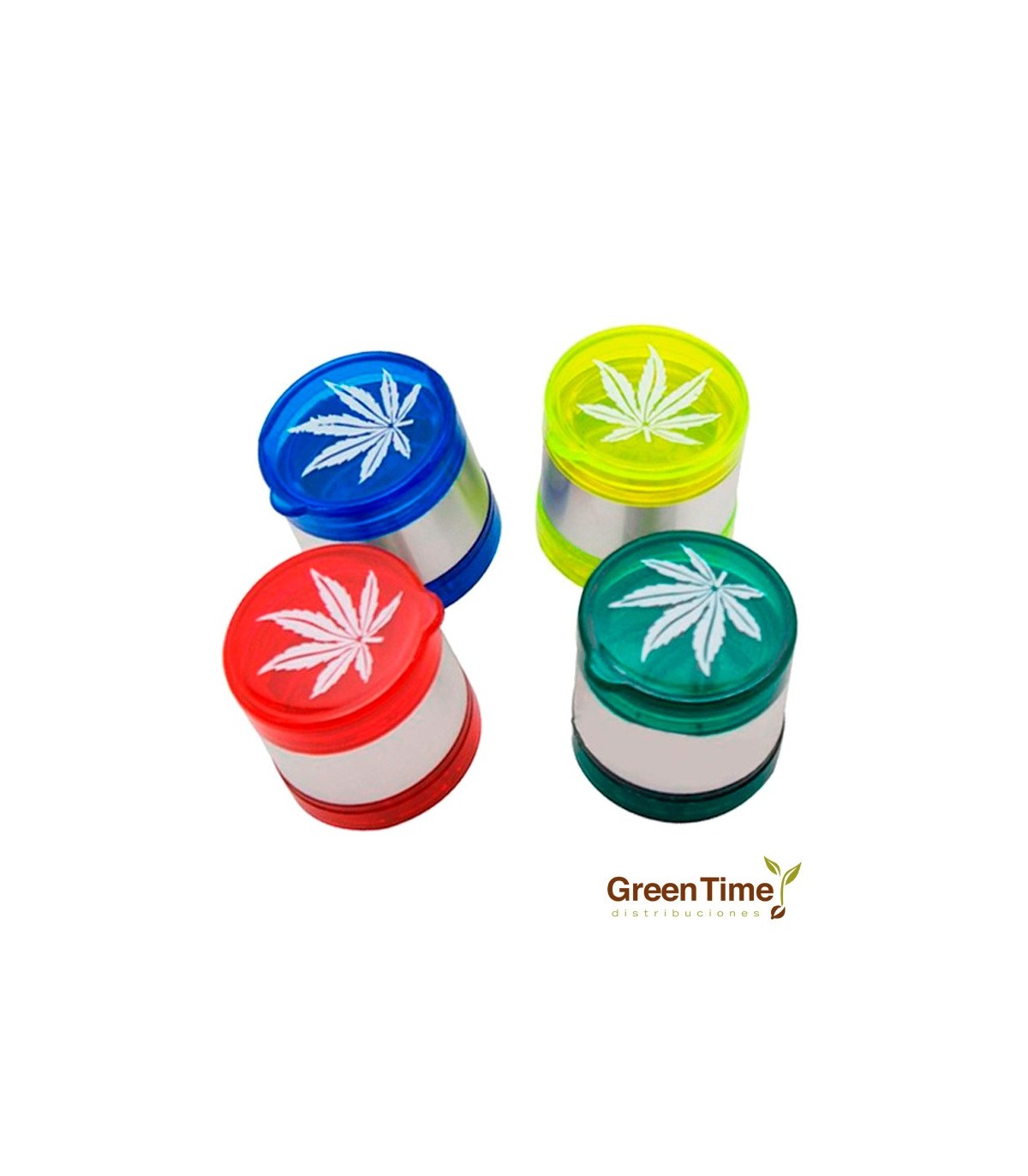 En Green Time Distribuciones presentamos el Grinder Acrílico de 5 partes con detalle de hoja de marihuana. Este grinder, viene diseñado con la parte central en metal, y una hoja de nuestra planta favorita en la parte superior del grinder.