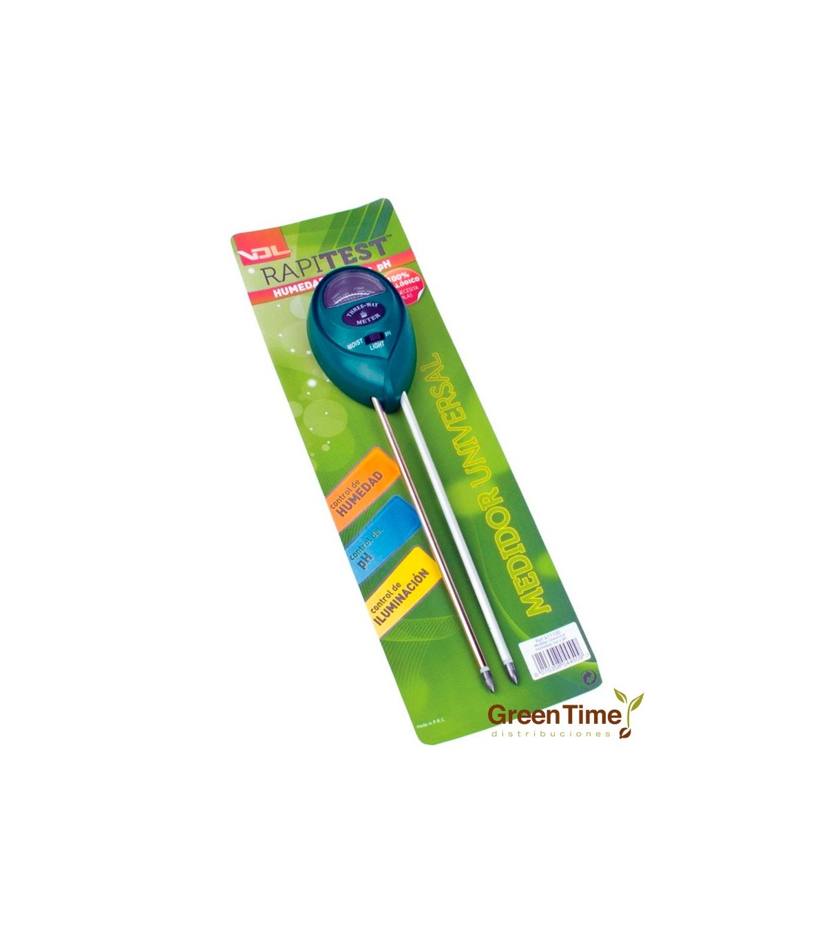 En Green Time Distribuciones presentamos el Rapitest Combi Medidor, una herramienta práctica y eficiente diseñada para controlar de manera sencilla los principales parámetros del sustrato en cultivos de interior y exterior. Este dispositivo permite medir la humedad, el pH y la luz, tres factores determinantes para asegurar un desarrollo saludable y equilibrado de las plantas.