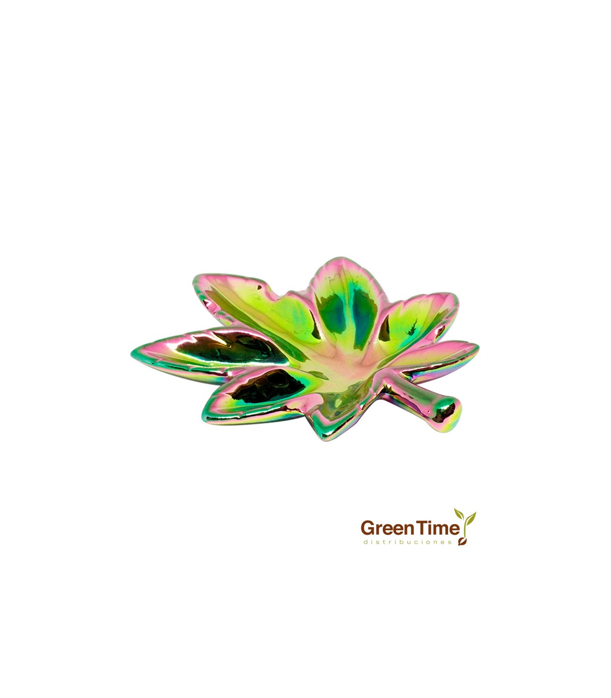 En Green Time Distribuciones presentamos el Cenicero Hoja de Marihuana, un cenicero con forma de hoja de marihuana y acabado metálico multicolor que cambia de tono según la luz. Es un accesorio ideal tanto para fumadores como para quienes buscan un toque decorativo llamativo y original.